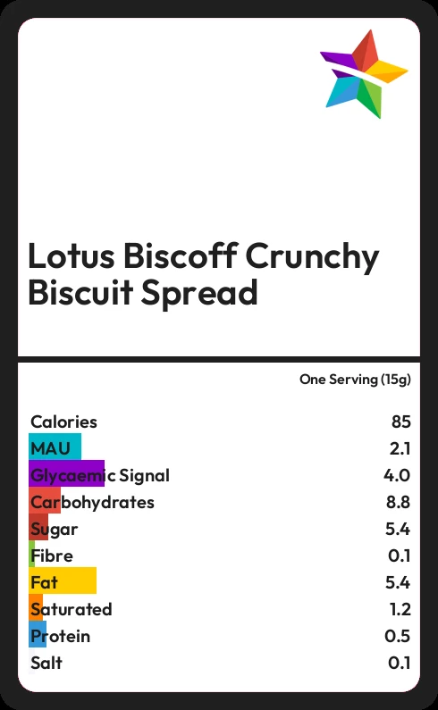 Lotus Biscoff Crunchy Biscuit Spread contains 85.4 calories in one Serving (15g).