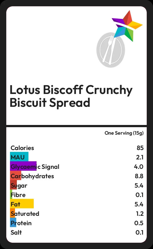 Lotus Biscoff Crunchy Biscuit Spread contains 85.4 calories in one Serving (15g).