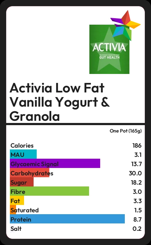 Activia Low Fat Vanilla Yogurt & Granola contains 186.5 calories in one Pot (165g).