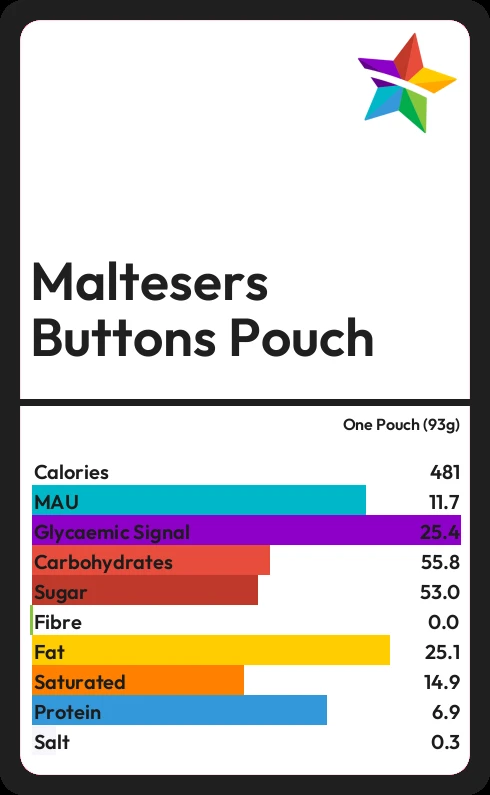 Maltesers Buttons Pouch contains 53.0g sugar in one Pouch (93g) - that is around 13 cubes of sugar.