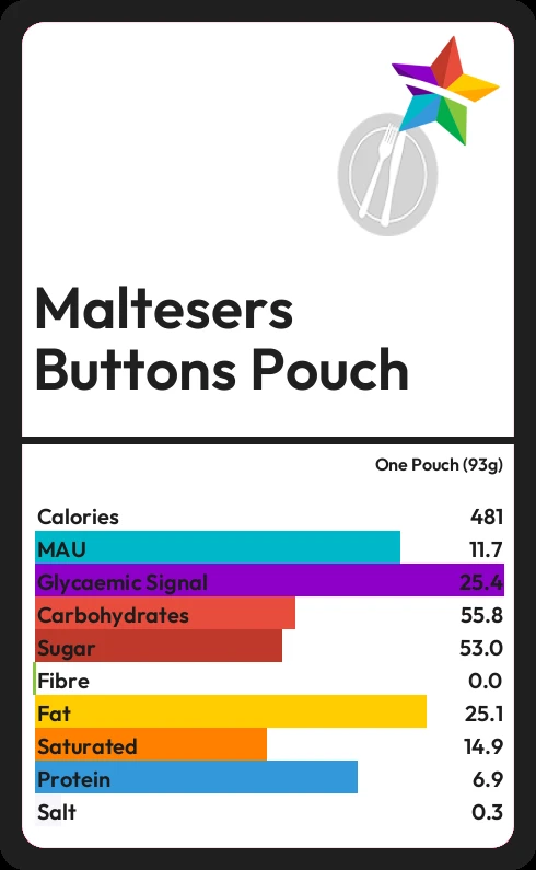 Maltesers Buttons Pouch contains 53.0g sugar in one Pouch (93g) - that is around 13 cubes of sugar.