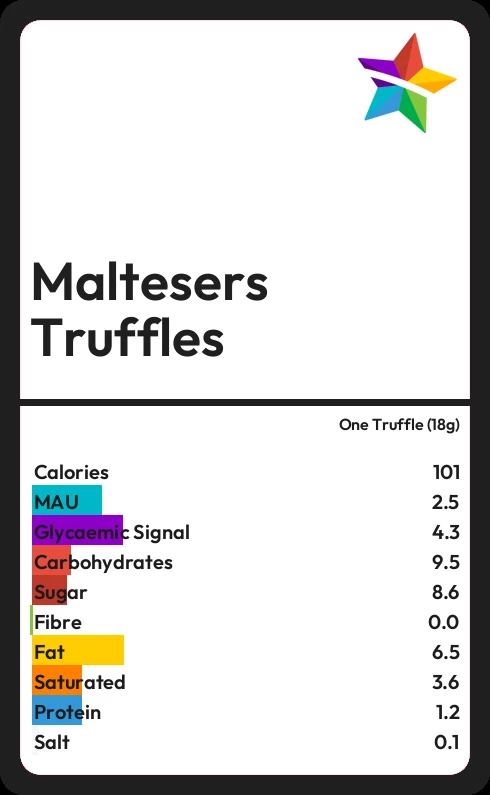 Maltesers Truffles contains 8.6g sugar in one Truffle (18g) - that is around 2 cubes of sugar.