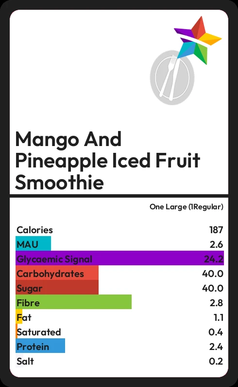 Mango And Pineapple Iced Fruit Smoothie contains 187 calories in one Large (1Regular).