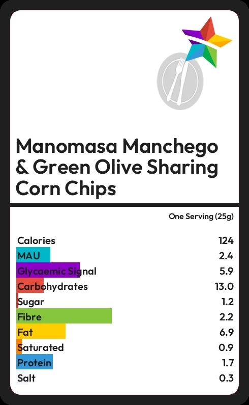 Manomasa Manchego & Green Olive Sharing Corn Chips contains 1.2g sugar in one Serving (25g)