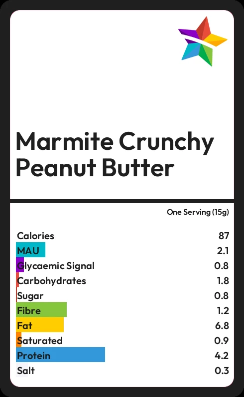Marmite Crunchy Peanut Butter contains 0.8g sugar in one Serving (15g)