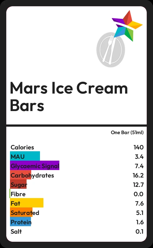Mars Ice Cream Bars contains 12.7g sugar in one Bar (51ml) - that is around 3 cubes of sugar.