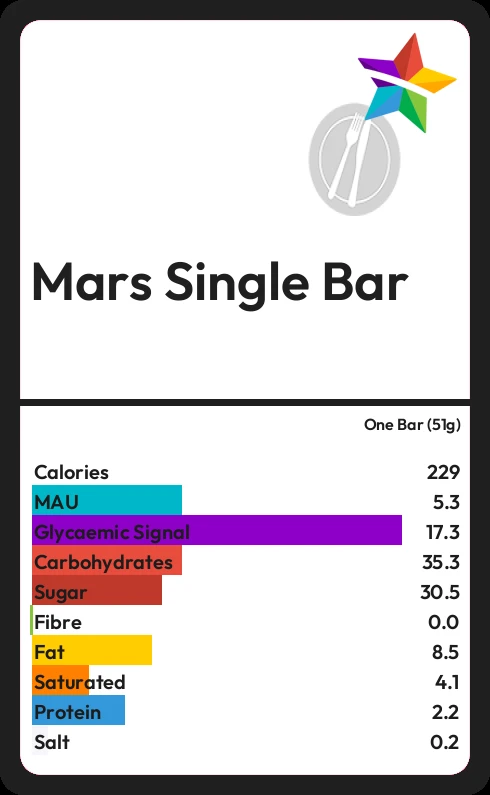 Mars Single Bar contains 30.5g sugar in one Bar (51g) - that is around 8 cubes of sugar.