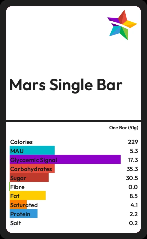 Mars Single Bar contains 30.5g sugar in one Bar (51g) - that is around 8 cubes of sugar.