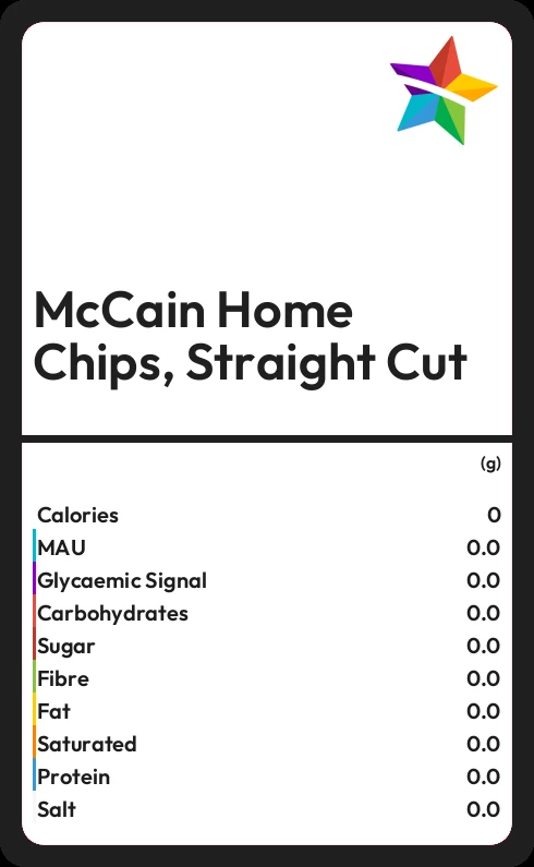 In 100g of McCain Home Chips, Straight Cut there are 4.0g of fat of which 0.4g are saturated.