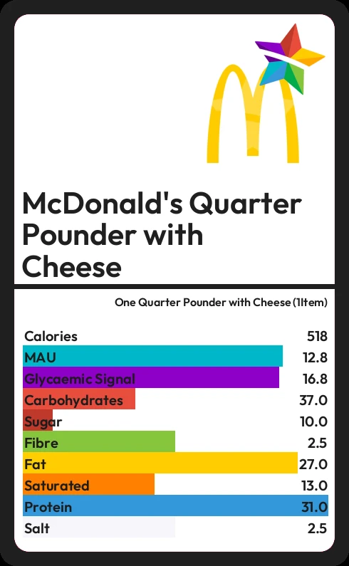 Ingredients Quarter Beef Patty 100% Pure Beef. No additives, fillers, binders, preservatives or flavour enhancers. Just pure forequarter and flank. A little salt and pepper is added to season after cooking. Quarter Pounder Bun Allergen Ingredient: WHEAT Flour (contains Calcium, Iron, Niacin, Thiamine), Water, Sugar, Allergen Ingredient: SESAME Seeds, Rapeseed Oil, Salt, Yeast, Emulsifier (Mono- and Diacetyl Tartaric Acid Esters of Mono- and Diglycerides of Fatty Acids), Allergen Ingredient: WHEAT Gluten, Preservative (Calcium Propionate), De-activated Yeast, Antioxidant (Ascorbic Acid). Potential Allergen Ingredient: N. B. May contain traces of milk, barley and rye. Cheddar Cheese Slice (processed) Vegetarian Cheddar (51%) (Allergen Ingredient: MILK), Water, Vegetarian Cheese (9%) (Allergen Ingredient: MILK), Whey Powder (Allergen Ingredient: MILK), Butter (Allergen Ingredient: MILK), Emulsifying Salts (Trisodium Citrate, Citric Acid), Allergen Ingredient: MILK Proteins, Natural Cheese Flavouring (Allergen Ingredient: MILK), Salt, Colours (Beta Carotene, Paprika Extract), Anti-Caking Agent (Sunflower Lecithin Oil). Tomato Ketchup 66% Tomato Puree (equivalent to 184g tomatoes per 100g ketchup), Glucose-Fructose Syrup, Spirit Vinegar, Salt, Spice Extracts. Dill Pickle Slices Gherkins, Water, Spirit Vinegar, Salt, Firming Agent (Calcium Chloride), Natural Flavouring, Preservative (Potassium Sorbate). Onion 100% White Onions. Mustard Water, Spirit Vinegar, Allergen Ingredient: MUSTARD Seed (13%), Salt, Spices, Spice Extract