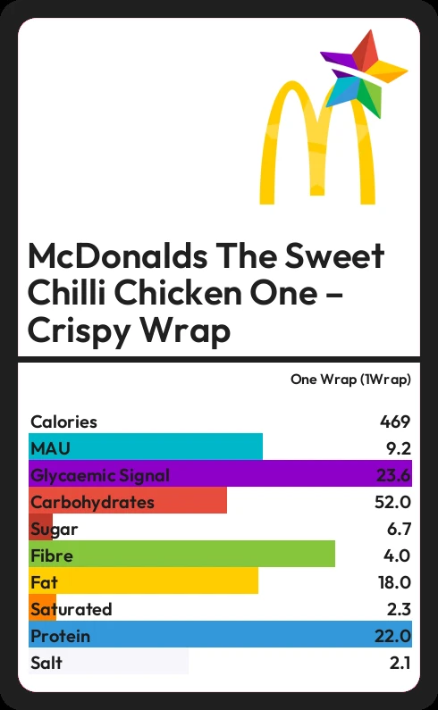 McDonalds The Sweet Chilli Chicken One – Crispy Wrap contains 469 calories in one Wrap (1Wrap).