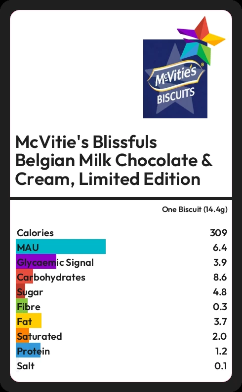 McVitie's Blissfuls Belgian Milk Chocolate & Cream, Limited Edition contains 4.8g sugar in one Biscuit (14.4g) - that is around 1 cube of sugar.