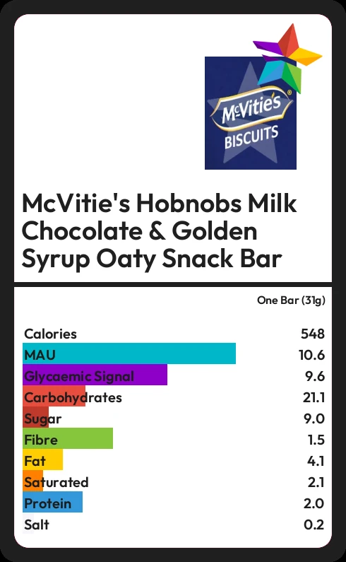 McVitie's Hobnobs Milk Chocolate & Golden Syrup Oaty Snack Bar contains 548.1 calories in one Bar (31g).