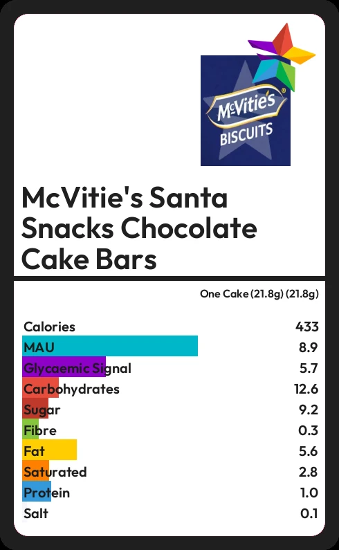 McVitie's Santa Snacks Chocolate Cake Bars contains 9.2g sugar in one Cake (21.8g) (21.8g) - that is around 2 cubes of sugar.