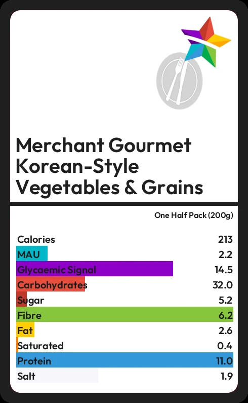 Merchant Gourmet Korean-Style Vegetables & Grains contains 212 calories in one Half Pack (200g).