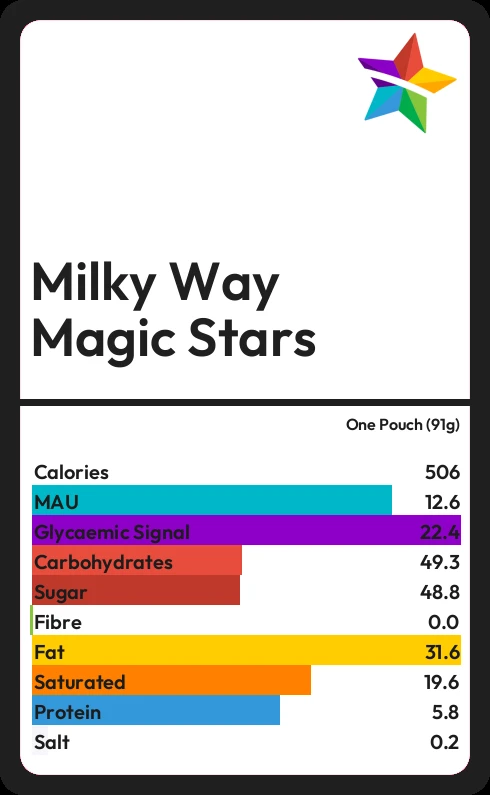 Milky Way Magic Stars contains 48.8g sugar in one Pouch (91g) - that is around 12 cubes of sugar.