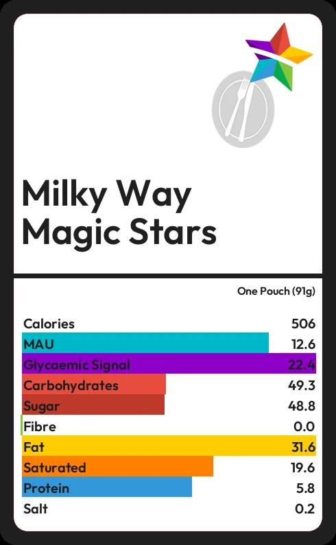 Milky Way Magic Stars contains 48.8g sugar in one Pouch (91g) - that is around 12 cubes of sugar.