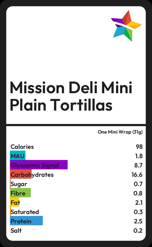 Mission Deli Mini Plain Tortillas contains 0.7g sugar in one Mini Wrap (31g)
