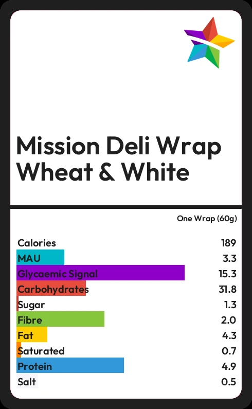 Mission Deli Wrap Wheat & White contains 1.3g sugar in one Wrap (60g)