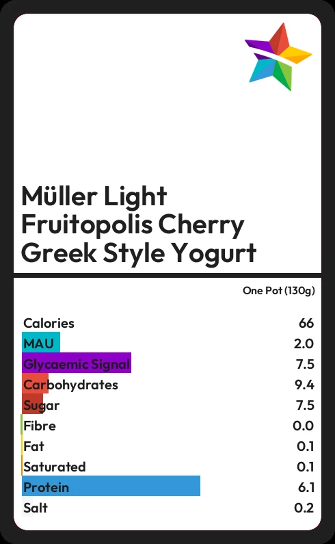 Müller Light Fruitopolis Cherry Greek Style Yogurt contains 7.5g sugar in one Pot (130g) - that is around 2 cubes of sugar.