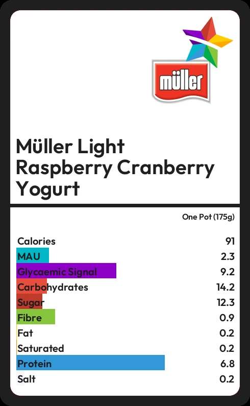 Müller Light Raspberry Cranberry Yogurt contains 12.3g sugar in one Pot (175g) - that is around 3 cubes of sugar.