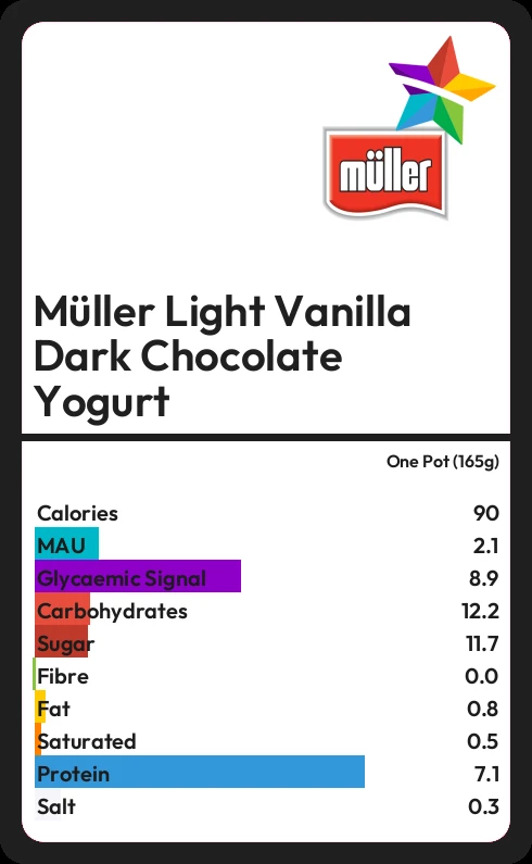 Müller Light Vanilla Dark Chocolate Yogurt contains 90.8 calories in one Pot (165g).