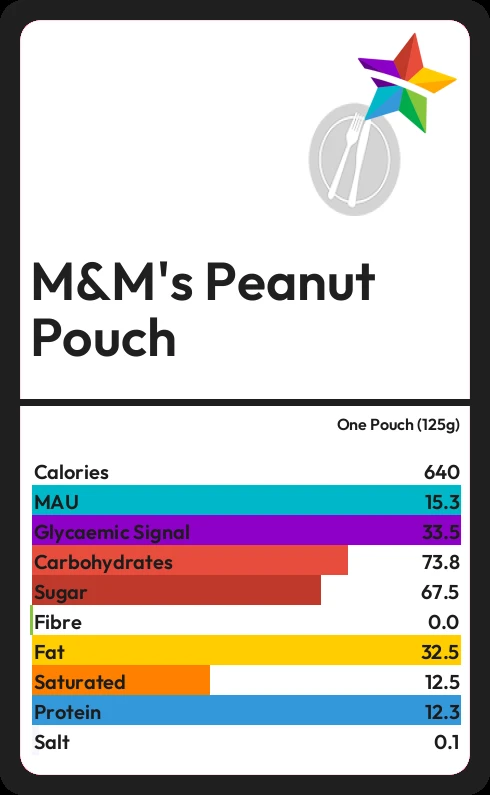M&M's Peanut Pouch contains 67.5g sugar in one Pouch (125g) - that is around 17 cubes of sugar.