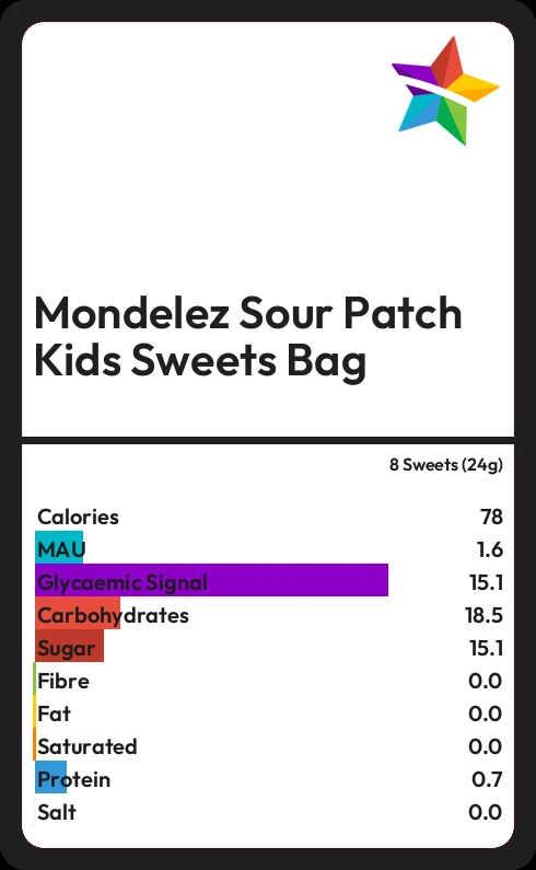 Mondelez Sour Patch Kids Sweets Bag contains 15.1g sugar in 8 Sweets (24g) - that is around 4 cubes of sugar.