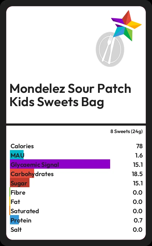 Mondelez Sour Patch Kids Sweets Bag contains 15.1g sugar in 8 Sweets (24g) - that is around 4 cubes of sugar.