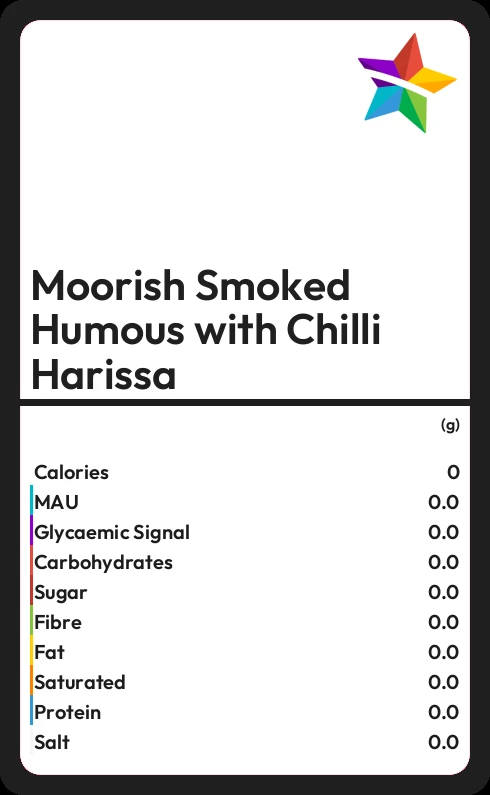 Moorish Smoked Humous with Chilli Harissa contains 0.8g sugar in 100g