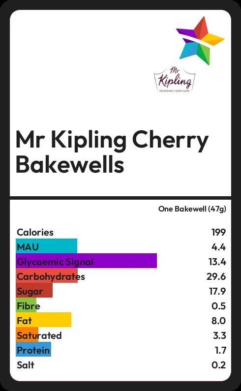 Mr Kipling Cherry Bakewells contains 199.3 calories in one Bakewell (47g).