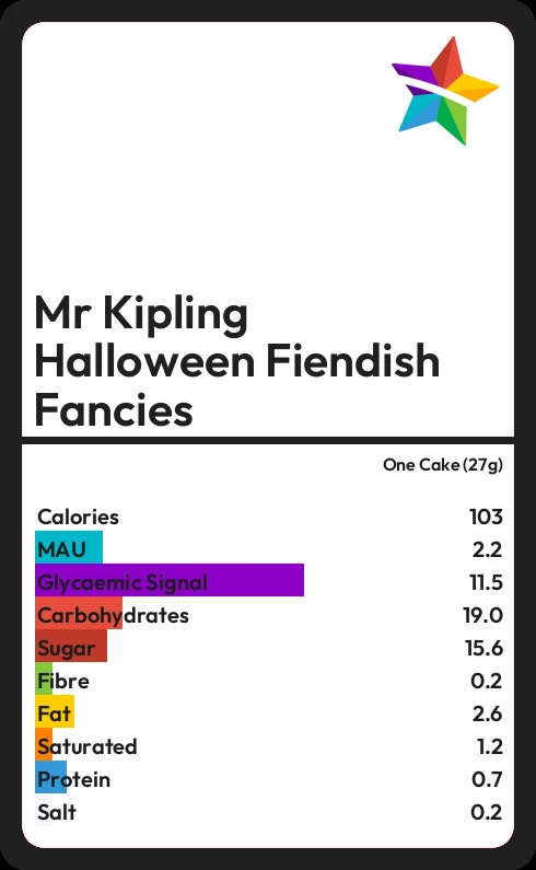 Mr Kipling Halloween Fiendish Fancies contains 103.4 calories in one Cake (27g).