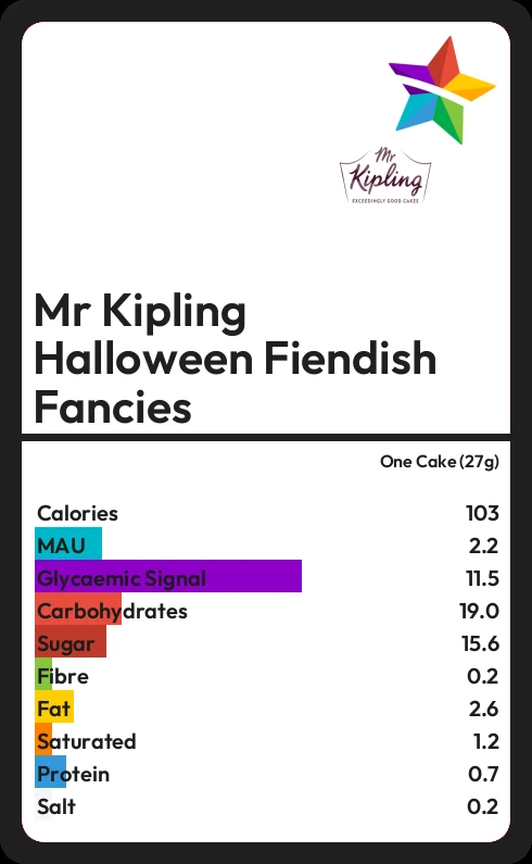 Mr Kipling Halloween Fiendish Fancies contains 15.6g sugar in one Cake (27g) - that is around 4 cubes of sugar.