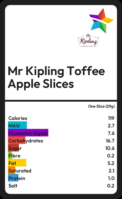 Mr Kipling Toffee Apple Slices contains 118.6 calories in one Slice (29g).