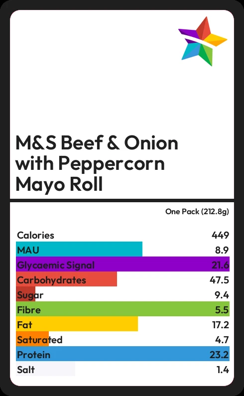 M&S Beef & Onion with Peppercorn Mayo Roll contains 449 calories in one Pack (212.8g).