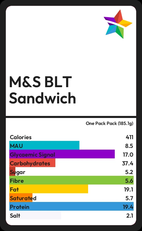 In one Pack Pack (185.1g) of M&S BLT Sandwich there are 19.1g of fat of which 5.7g are saturated.