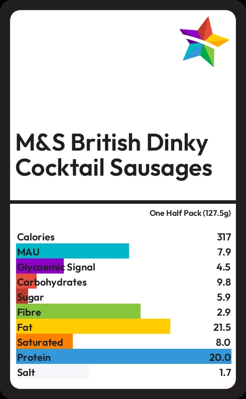 M&S British Dinky Cocktail Sausages contains 317.5 calories in one Half Pack (127.5g).
