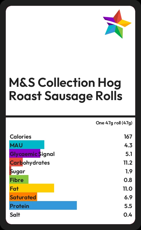 M&S Collection Hog Roast Sausage Rolls contains 167.3 calories in one 47g roll (47g).