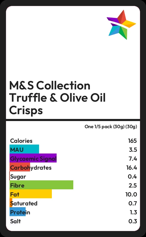 M&S Collection Truffle & Olive Oil Crisps contains 0.4g sugar in one 1/5 pack (30g) (30g)