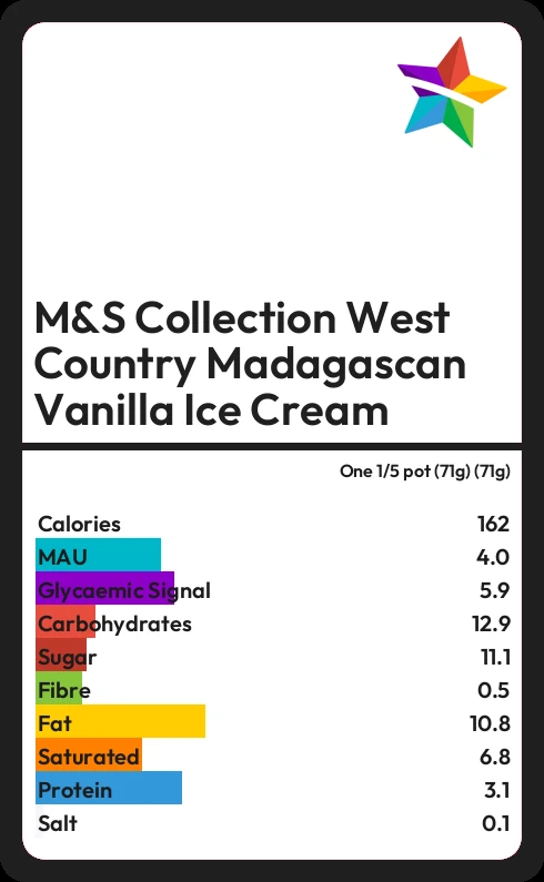 In one 1/5 pot (71g) (71g) of M&S Collection West Country Madagascan Vanilla Ice Cream there are 10.8g of fat of which 6.8g are saturated.