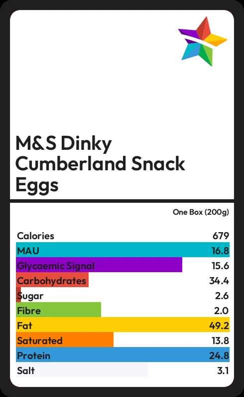 M&S Dinky Cumberland Snack Eggs contains 678 calories in one Box (200g).