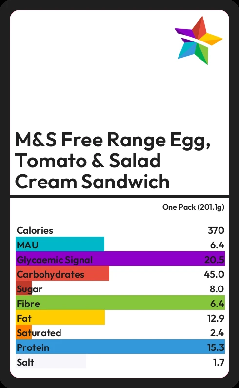M&S Free Range Egg, Tomato & Salad Cream Sandwich contains 8.0g sugar in one Pack (201.1g) - that is around 2 cubes of sugar.