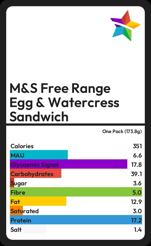 M&S Free Range Egg & Watercress Sandwich contains 351.1 calories in one Pack (173.8g).