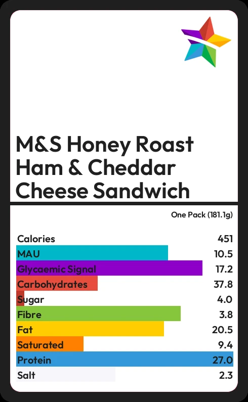 M&S Honey Roast Ham & Cheddar Cheese Sandwich contains 450.9 calories in one Pack (181.1g).