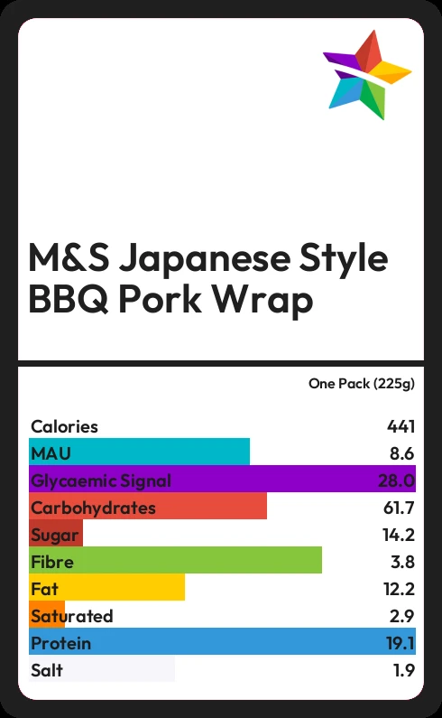 M&S Japanese Style BBQ Pork Wrap contains 441 calories in one Pack (225g).