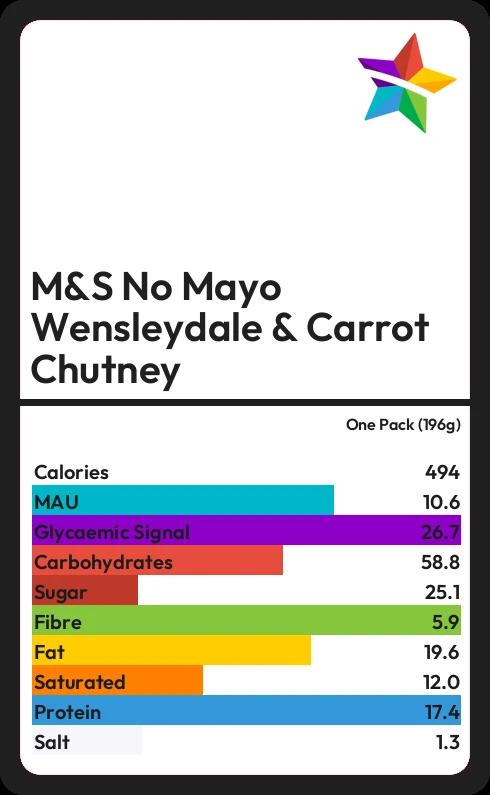 M&S No Mayo Wensleydale & Carrot Chutney contains 493.9 calories in one Pack (196g).