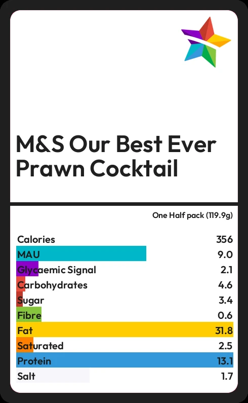 M&S Our Best Ever Prawn Cocktail contains 356.1 calories in one Half pack (119.9g).
