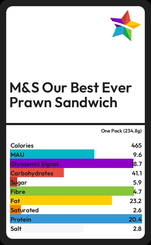 M&S Our Best Ever Prawn Sandwich contains 464.9 calories in one Pack (234.8g).