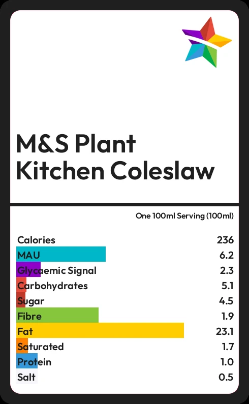 M&S Plant Kitchen Coleslaw contains 236 calories in one 100ml Serving (100ml).