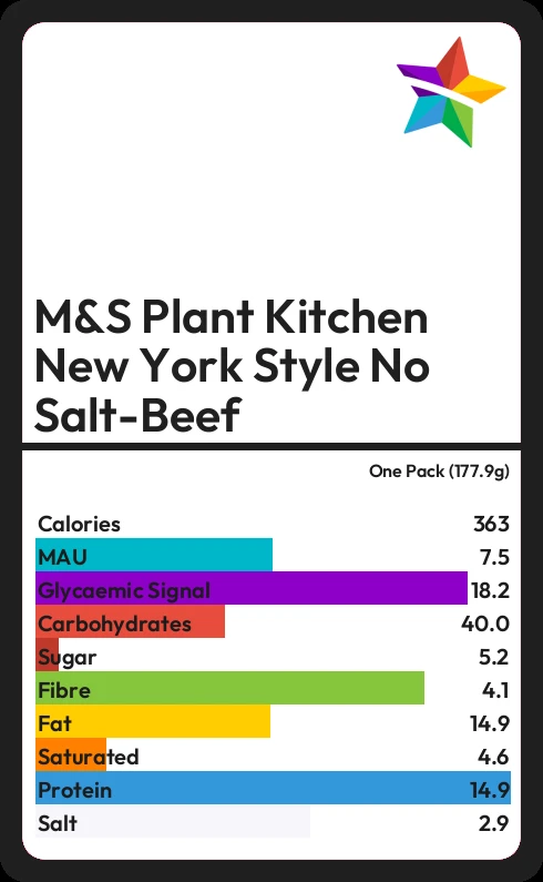 M&S Plant Kitchen New York Style No Salt-Beef contains 362.9 calories in one Pack (177.9g).